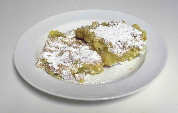 First off, I suggest a fork for these. They’re sticky as all get out and they stuck to the pan even with parchment paper. Guess that’s to be expected when a crust is made of flour, butter, and powdered sugar. Next time, I’m greasing and flouring and parchment papering. All that being said, no regrets.
