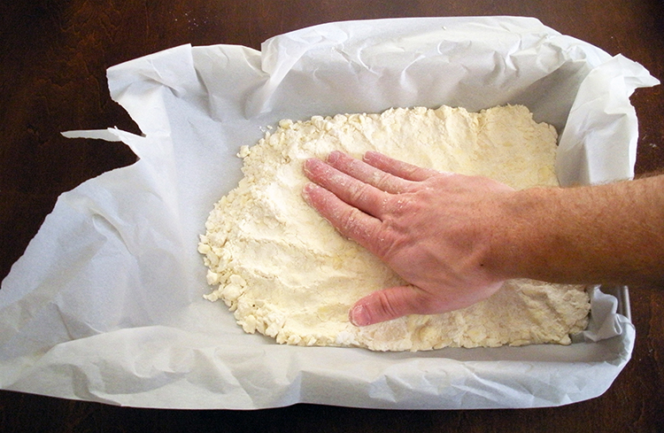 You’ll take this mixture and press it into a 9×13 pan. I lined it with parchment paper and it still stuck, so I recommend greasing it and then flouring it as well.