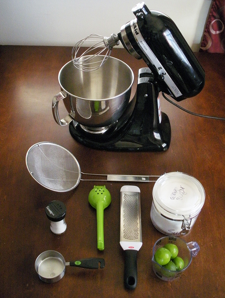 In the electric mixer, beat the eggs on high until they’re light yellow. Add in the sugar and salt a bit at a time while the mixer is running. Keep the mixer running at high speed and add the Key lime juice and zest.