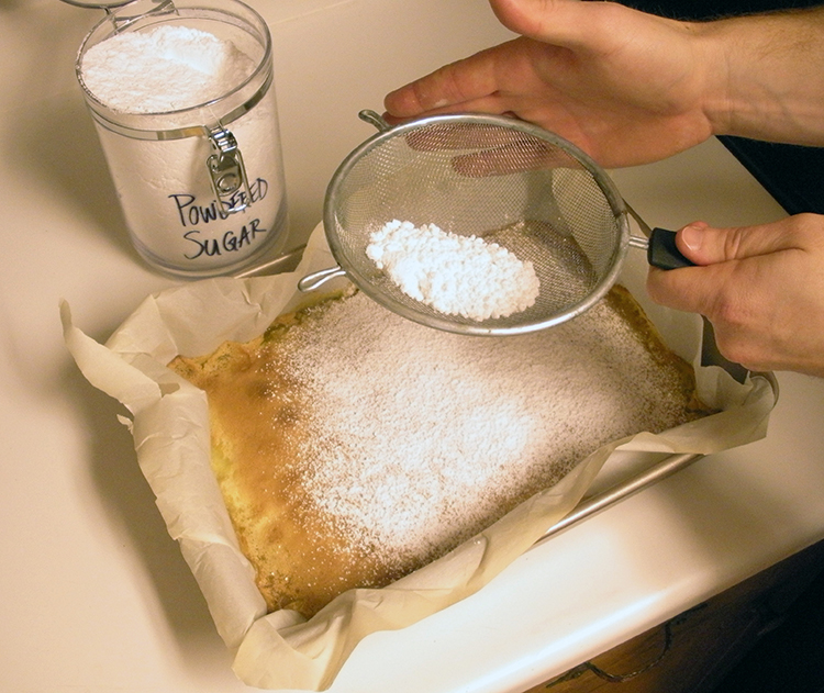 Once everything is done baking, sift powdered sugar over the top while they’re still warm. Before you cut the pan of deliciousness into bars, cool everything down. Once it’s cut up into bars, start munching away.