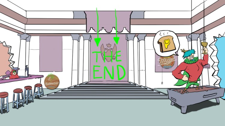 In Scene 11, we have the closing words drop from the top of the frame and take the place formerly occupied by Kevin and the ThroneCouch. King Hugo continues his toasting.