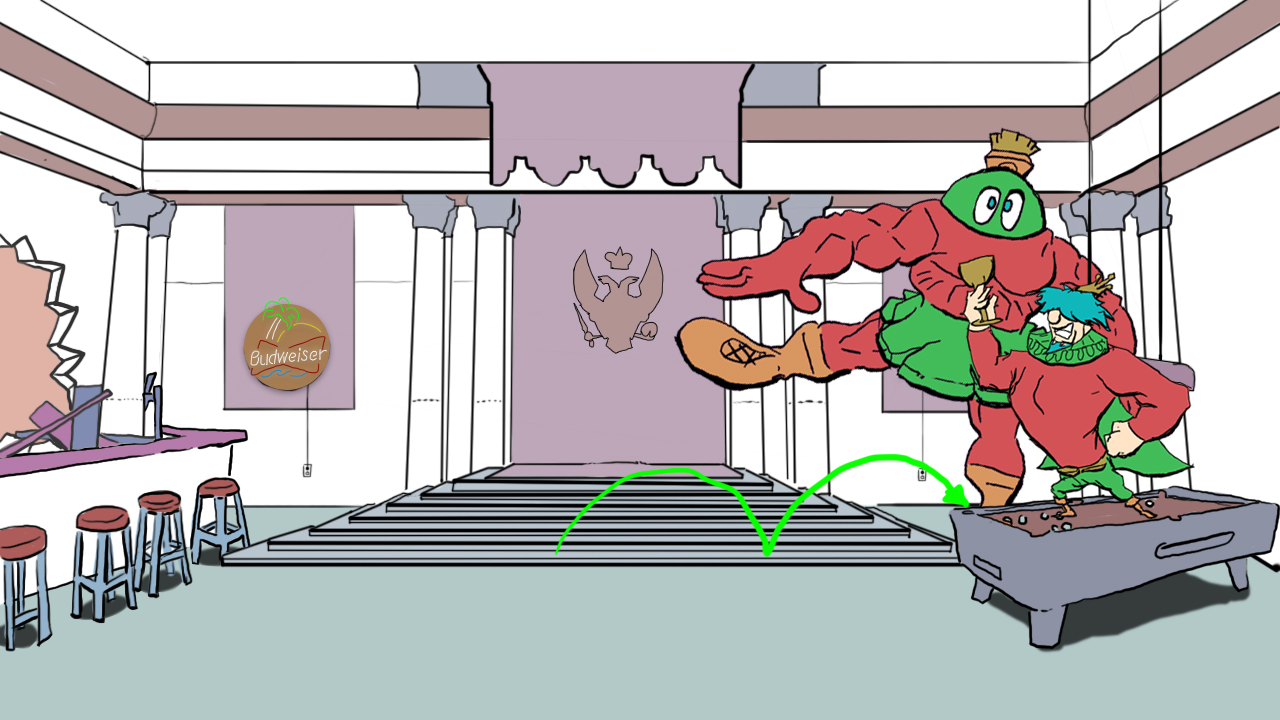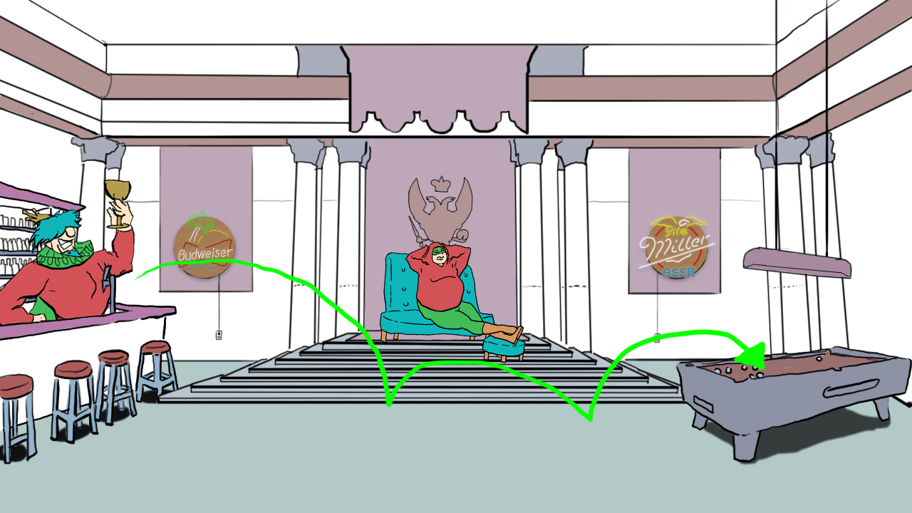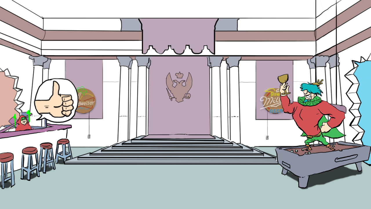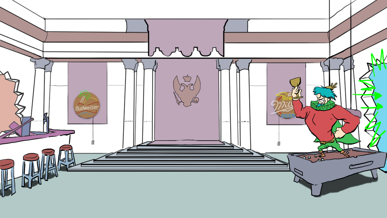 In Scene 2, King Hugo the Nominally Intelligent has just finished mixing a drink at the bar and bounds across the throne room, leaping atop the pool table to give a hearty toast. Kevin the Sidekick (TM) watches impassively, lounging on the ThroneCouch (also TM and patent-pending). He’s seen this sort of behavior before.