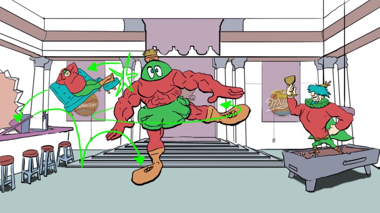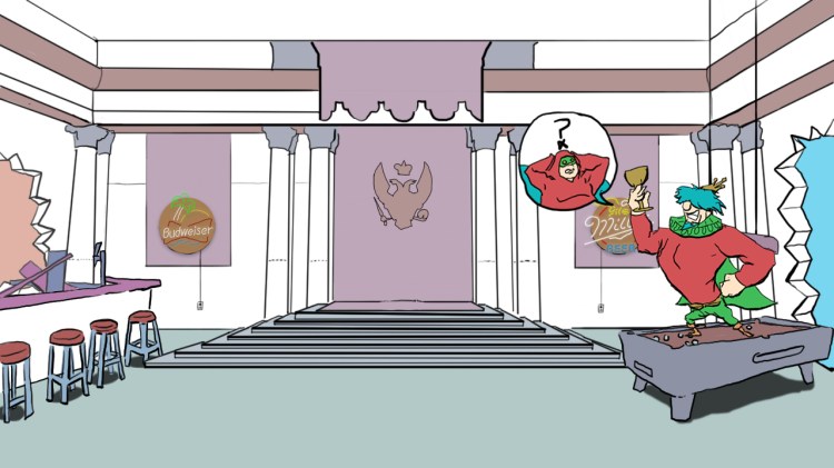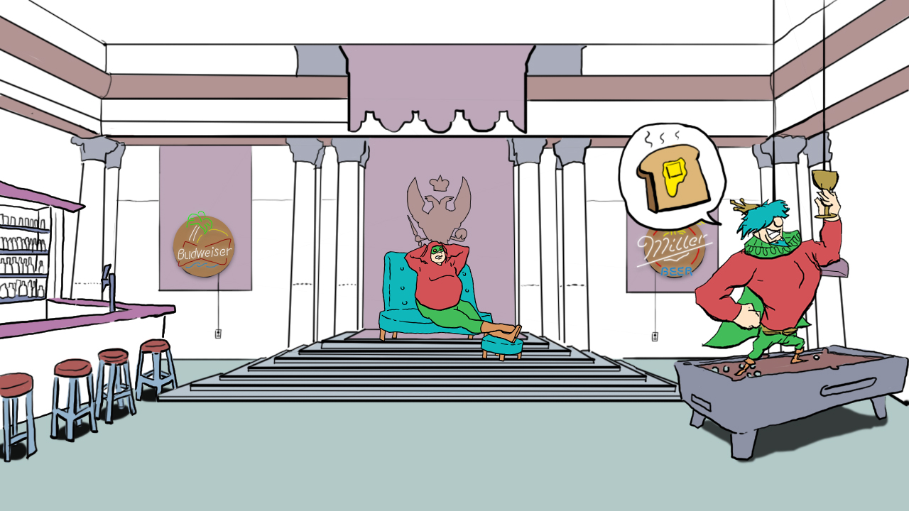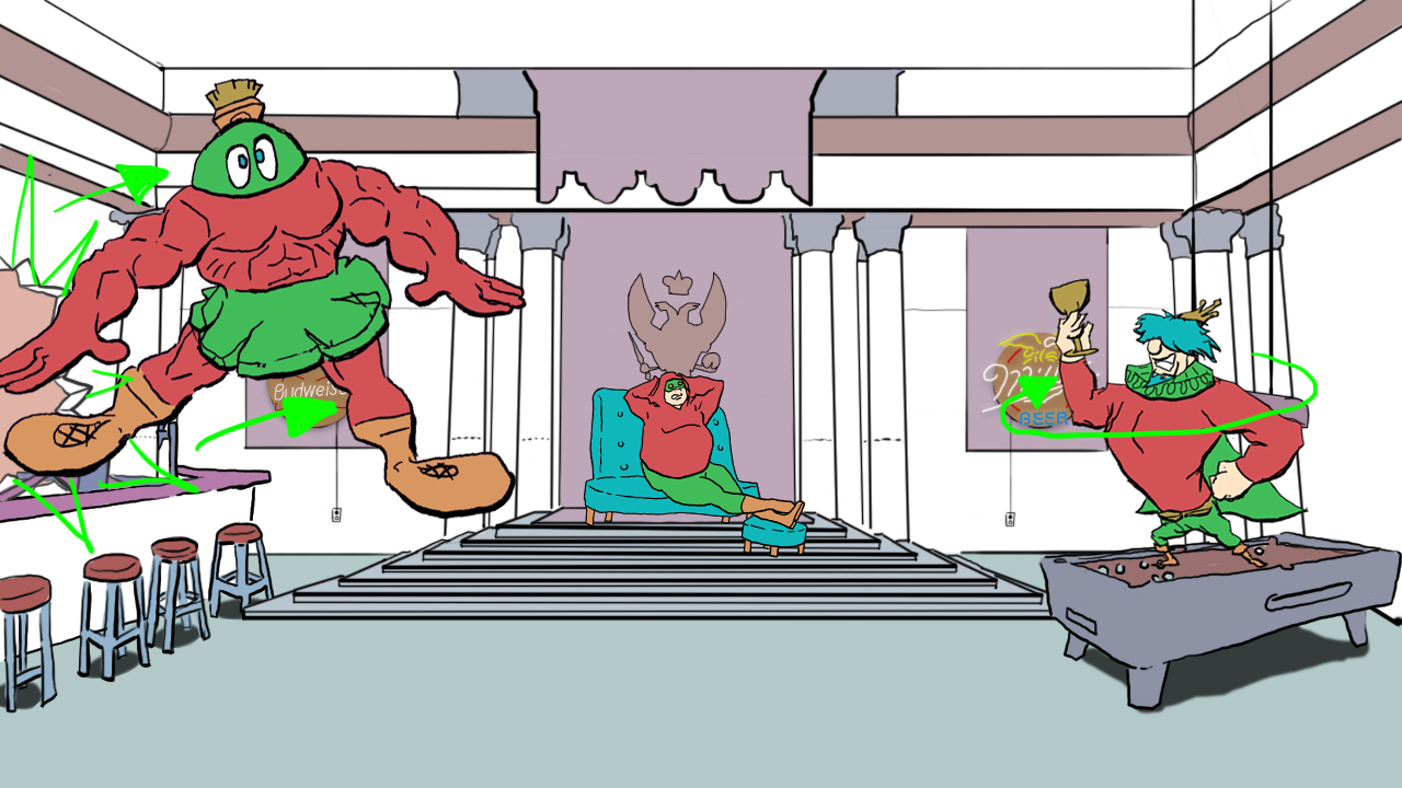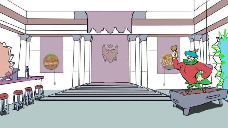 In Scene 2, King Hugo the Nominally Intelligent has just finished mixing a drink at the bar and bounds across the throne room, leaping atop the pool table to give a hearty toast. Kevin the Sidekick (TM) watches impassively, lounging on the ThroneCouch (also TM and patent-pending). He’s seen this sort of behavior before.