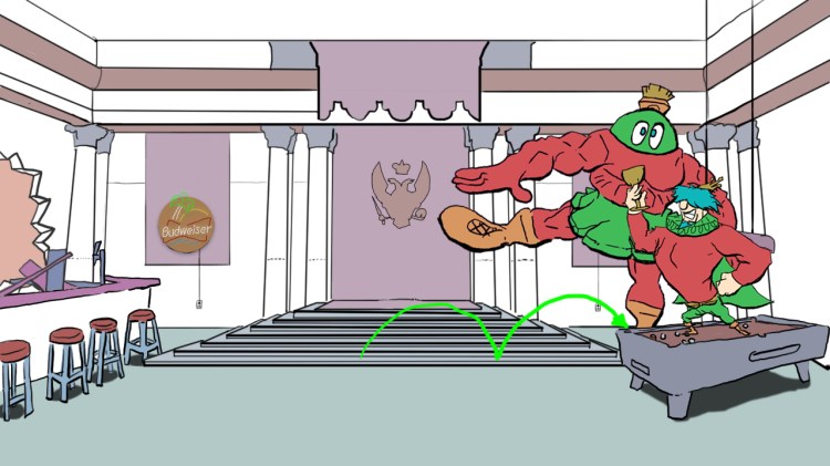 In Scene 5, the MDM continues his dancing rampage (“dampage”….? I’ll work on that one) across the throne room, inadvertently roundhouse kicking Kevin (assuredly awake now) as well as the ThroneCouch into the rubble of the former bar.