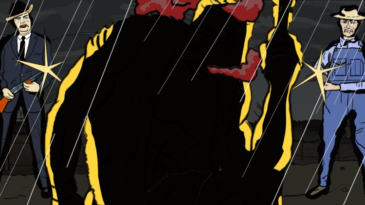 They both stop suddenly as lightning flashes, silhouetting both of them and the giant figure that has appeared in front of them with glowing red eyes and smoke wafting from its head.